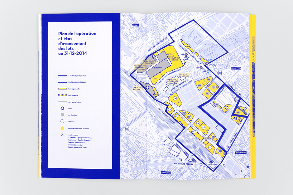 In 2011, Bornstein & Sponchiado won the call for tenders for the realization of the visual identity of Paris Batignolles Aménagement, SPLA in charge of the management of the development project of the Clichy-Batignolles area in which the various lots are awarded to large French and international architectural firms. Identity is available on different types of media, from the annual reports to the wishes.